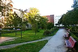 Der Koppenplatz besteht aus dem zentralen Park mit Kinderspielplatz südlich sowie aus den Straßen und ihrer Bebauung, die den Platz im Westen, Osten und Süden begrenzen.