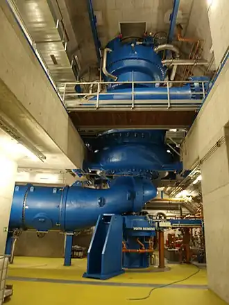 - Turbinentype: sechsdüsige Peltonturbine mit maximal 25,3 m3/s Durchfluss bei einer Wassergeschwindigkeit an den Düsen von etwa 460 km/h.