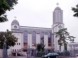 Zur dreischiffigen Basilika führt eine Treppe hinauf. Unter dem Gottesdienstraum befinden sich Räumlichkeiten für die Gemeinde eingerichtet. Die Eingangsfront wird von zwei Türmen flankiert, am entgegengesetzten Ende befinden sich drei Apsiden als Abschluss.