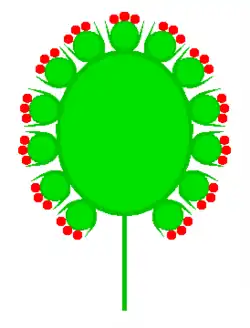 Der Ausdruck Korb (lat. Calathidium, Anthodium), synonym gebraucht auch Körbchen, Kopf, Köpfchen, Blütenkopf, Blütenkorb, Blütenköpfchen[1], bezeichnet in der Botanik einen Blütenstand. Alle Blüten sitzen direkt an der gestauchten und tellerartig verbreiterten, teils auch in der Mitte vertieften Sprossachse, an der Basis befindet sich stets eine Hochblatthülle, das Involucrum. Vom Aufbau her ist der Korb dem Köpfchen sehr ähnlich. Man spricht allerdings praktisch nur bei der Familie der Korbblütler von einem Korb, sonst immer von einem Köpfchen. Diese Unterscheidung ist vor allem auf den Bau der Einzelblüten zurückzuführen: Sie sind entweder als Röhrenblüten oder Zungenblüten ausgebildet und so nur bei den Korbblütengewächsen zu finden. Die Röhrenblüten im Korb sind bei manchen Arten in hexagonaler Kreispackung angeordnet.[2]