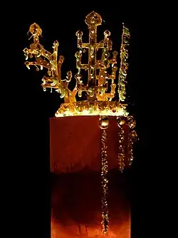 Diese Silla-Goldkrone (5. Jahrhundert) stammt aus dem Nordgrab Hwangnamdaechong in Gyeongju. Man vermutet, dass im Nordgrab eine Frau bestattet wurde, weil dort mehr Schmuckstücke als im Südgrab gefunden wurden, darunter ein silberner Gürtel mit der Inschrift 'Buindae' (Frauengürtel). Eine goldene Krone weist auf die politische und soziale Stellung ihres Besitzers hin.