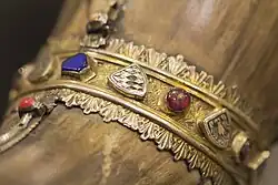 Die silbervergoldete Einfassung dieses Korneliushorns entstand wohl in der zweiten Hälfte des 14. Jahrhunderts oder später, worauf die Wappenschilde, silbervergoldeten Bänder und Edelsteine der Verzierung hinweisen. Die Wappen verweisen auf eine Herkunft außerhalb des Rheinlands, laut Franz Bock (1858)[2] und Herbert Rode (1951)[5] deuten sie u. a. auf böhmische, bayerische und französische Adelshäuser hin.