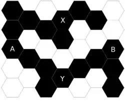 Man färbe zufällig jedes Hexagon des unendlichen Waben-Gitters schwarz jeweils stochastisch unabhängig voneinander mit Wahrscheinlichkeit und weiß mit Wahrscheinlichkeit . Seien vier (nicht notwendig verschiedene) solche Hexagone. Seien und die Ereignisse, dass es einen schwarzen Pfad von nach respektive von nach gibt. Dann besagt die FKG-Ungleichung, dass diese Ereignisse positive korreliert sind: . In anderen Worten, es wird vorausgesetzt, dass es bereits den einen schwarzen Pfad gibt, wird die Existenz des anderen Pfades wahrscheinlicher.
