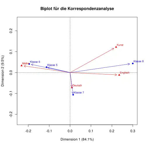 2. Position der Lieblingsfächer: Ebenso werden die verschiedenen Lieblingsfächer (Mathe, Deutsch, Englisch, Kunst) als Punkte (Dreiecke) im Biplot dargestellt. Die Position der Punkte zeigt, wie stark bestimmte Fächer mit bestimmten Klassenstufen verbunden sind. Wenn die Pfeile, die von einer Klassenstufe zu einem bestimmten Fach zeigen, lang sind, deutet dies darauf hin, dass dieses Fach von dieser Klassenstufe bevorzugt wird.