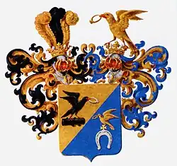 Das Schild ist links abgeschrägt. Im ersten goldenen Abschnitt befindet sich auf einem schwarzen Stumpf eine schwarze Lerche mit scharlachroten Augen, Schnabel und Krallen, die einen silbernen Ring im Schnabel hält. Im zweiten azurblauen Abschnitt ist ein silbernes Hufeisen mit nach unten gerichteten Spitzen zu sehen, über dem ein goldenes gleicharmiges Kreuz mit breiten Enden ruht. Auf diesem Kreuz sitzt ein goldener Rabe mit scharlachroten Augen, Schnabel und Krallen, der einen goldenen Ring im Schnabel hält. Über dem Schild befinden sich zwei edle, gekrönte Helme. Der rechte Helm trägt drei Straußenfedern – schwarz in der Mitte und golden an den Außenseiten. Der linke Helm zeigt einen goldenen Raben mit scharlachroten Augen, Schnabel und Krallen, der einen goldenen Ring im Schnabel hält. Der Wappenmantel ist rechts schwarz und gold und links azurblau und gold. (General Armorial, XIII, 35).