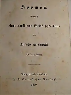 Fast zehn Jahre zuvor, 1826, hatte er in einem französischen Salon, dann vom Herbst 1827 bis zum Frühjahr 1828 in Berlin Vorlesungen zur physischen Weltbeschreibung gehalten – insgesamt 62 an der Universität und sechzehn in einem parallelen Zyklus im Haus der Sing-Akademie zu Berlin.[2] Diese „Kosmos-Vorlesungen“ galten als der kulturelle Höhepunkt des Jahres 1827 in Berlin.[3] Auf Anregung von Konrad Levezow bedankte sich das Auditorium bei Humboldt für die Vortragsreihe mit einer Ehrenmedaille. Es wundert deshalb nicht, dass bald schon Forderungen nach einer Publikation dieser von ihm völlig frei und ohne schriftliche Grundlage gehaltenen Vortragsreihe laut wurden und so unvermindert anhielten, dass Humboldt öffentlich Stellung bezog, um zu unterbinden, dass man Mitschriften veröffentlichte. Verleger bestürmten ihn, der trotz seines guten Verdienstes unter chronischer Geldknappheit litt, mit lukrativen Angeboten. Humboldt entschied sich letztendlich, sein Werk bei dem renommierten Verlagshaus Cotta verlegen zu lassen. Wichtig war ihm dabei neben dem guten Honorar der Druckort Berlin und die Möglichkeit, auch kurzfristig noch Verbesserungen vornehmen zu können. Alles wurde vertraglich genau festgelegt. Das Werk sollte in zwei Bänden (Band 1 für die objektive Weltbeschreibung und Band 2 für die empfindsame Weltanschauung) im Dezember 1829 veröffentlicht werden.