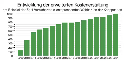 - ↑ a b Ausgewiesene Jahresdurchschnitte der Spalte „KBS“ (für Knappschaft-Bahn-See) bzw. „BKN“ (für Bundesknappschaft) in Zeile „Zu“ (alle Geschlechter zusammen) der Schlüsselnummer 18940 („Versicherte mit Wahltarif nach § 53 Abs. 4 SGB V“) der GKV-Statistik KM1/13 des Bundesministeriums für Gesundheit (BMG) im jeweiligen Jahr. PDF-Dateien der einzelnen Jahre: 2009, 2010, 2011, 2012, 2013, 2014, 2015, 2016, 2017, 2018, 2019, 2020, 2021, 2022, 2023, 2024. Übersicht der verfügbaren Jahre.