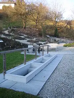 Der Quellstein ist rechts vom Eingang platziert, direkt vor der Sonnenterrasse und vor dem Salettl (Holzhaus).