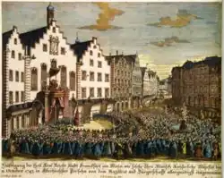- ↑ Hermann Meinert: Von Wahl und Krönung der deutschen Kaiser zu Frankfurt am Main. Mit dem Krönungsdiarium des Kaisers Matthias aus dem Jahre 1612, Verlag Waldemar Kramer, Frankfurt 1956, S. 27