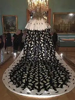 Ein Krönungs-, Fürsten- oder Königsmantel ist ein traditionelles, repräsentatives, meist ärmelloses Kleidungsstück von Staatsoberhäuptern. Fast immer gehörte eine Ausschmückung mit Hermelinfell dazu. Man sagte dem Hermelin solche „Reinigkeit“ nach, dass es „lieber durch Feuer laufet als in etwas unreines“. Diese Vorstellungen haben wohl bewirkt, dass Hermelinfell jahrhundertelang nur für die Kleidung allerhöchster Würdenträger verwendet werden durfte, obwohl es viele weit kostbarere Pelzarten gab und gibt. Hermelin gilt allgemein als Pelz der Kaiser und Könige.[2] In England proklamierte König Eduard III. etwa in der Mitte des 14. Jahrhunderts das Hermelin zum königlichen Pelz.[3] Charakteristisch für den Pelz als Standeszeichen sind die aufgesetzten Hermelinschweife mit ihren schwarzen Schwanzspitzen („getupftes“ Hermelin). Als heraldisches Pelzwerk erscheint das stilisierte Hermelin zudem als Rangzeichen beziehungsweise Herrschaftssymbol in den Wappen vieler Fürstenhäuser.