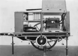 Der Hinterwagen bestand aus dem Fahrgestell und dem Aufbau. Auch hier entsprach das Fahrgestell dem des Teigknetwagens, allerdings unterschieden sich hier die Abmessungen ein wenig. Die Achse war anders gekröpft, aber Zubehör und Ersatzteile waren die Gleichen. Statt einer Apparatur zum Teigkneten befand sich auf dem Hinterwagen ein Maschinensatz mit 220 Volt Gleichstrom. Dieser 6,5-kW-Maschinensatz bestand aus dem Antriebsmotor, dem Stromerzeuger, der Schaltanlage und dem Schutzgehäuse.[4] Der Antriebsmotor war ein wassergekühlter Vierzylinder-Ottomotor mit einer Leistung von 13 PS und war im Fahrgestell fest eingebaut. Bei Volllast lag der Kraftstoffverbrauch bei 4 Litern die Stunde. Im Motor selber gab es einen Kraftstoffbehälter mit einem Fassungsvermögen von 75 Litern. Die Schaltanlage für den Motor war an der Vorderseite des Hinterwagens angebracht.[5] Um den Motor gegen die Witterung zu schützen, war über diesem ein Schutzgehäuse angebracht. Dieses bestand aus Stahlblech und hatte zwei linke und zwei rechte Seitenwände sowie eine Vorder- und Rückwand und ein Dach. Die Seitenwände mussten vor dem Betrieb geöffnet werden.[3][6]