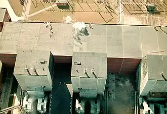Nebengebäude und Öltanks vom Schornstein gesehen