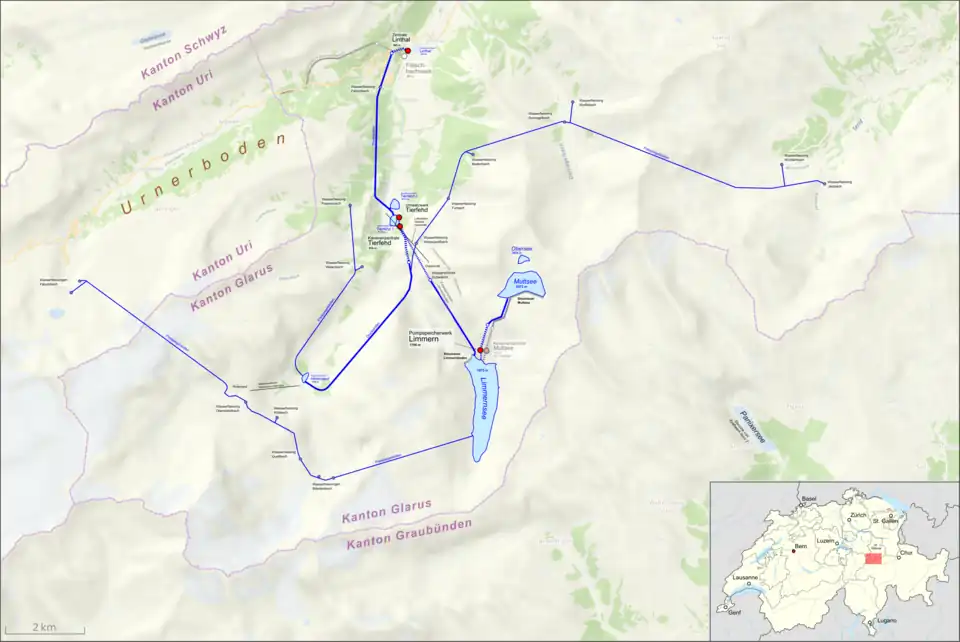 Alle Maschinenhäuser, Stauseen und Ausgleichsbecken befinden sich auf dem Gebiet der ehemaligen Gemeinde Linthal GL, das heute zu Glarus Süd gehört. Einzig die oberen Wasserfassungen des Fätschbachs liegen auf dem Urner Boden, der zum Kanton Uri gehört. Das dort gefasste Wasser wird über einen 12 km langen Freispiegelstollen dem Limmerensee zugeführt. Ebenso wird Wasser vom Fisetenbach über einen Freispiegelstollen dem Ausgleichsbecken Hintersand zugeführt. Während 22 Tagen im Sommer muss genügend Wasser dem Schreyenbachfall zugeführt werden, damit dieser wie früher in voller Pracht in die Tiefe stürzen kann.[19]