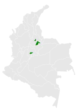 Im Jahr 2004 wurde sie in den Eichenwäldern von Charalá, in der Vereda Virolín, in Onzaga, in der Vereda Chaguata, in Mogotes, in der Vereda San Jose, in der Vereda Vega Grande und in der Vereda Cabecera sowie in Coromoro, in der Vereda Laguna und in der Vereda Mina nachgewiesen. Beide Restbestände haben sich in den letzten zwei Jahrzehnten erheblich verkleinert. Es gibt keine neueren Nachweise von Populationen in Cundinamarca, wo es nur noch wenige Waldparzellen gibt und die Art zuletzt 1954 gesichtet wurde.