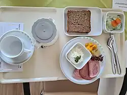 Die Krankenhausverpflegung umfasst alle verabreichten Nahrungsmittel und Flüssigkeiten während eines stationären Aufenthalts. Sie beinhaltet sowohl Standardkost als auch diätetische Modifikationen, die an die individuellen physiologischen und pathologischen Bedürfnisse der Patientinnen und Patienten angepasst werden.[1][2] Eine häufig genutzte Verteilmethode ist das Tablettsystem, bei dem individuell bestückte Tabletts auf den Stationen verteilt werden.[3]