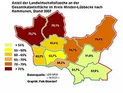 Der Anteil der landwirtschaftlichen Nutzfläche liegt mit 65,7 % deutlich über dem Landesdurchschnitt (49,2 %) und ist auch der höchste Wert aller Landkreise des Regierungsbezirkes Detmold (Durchschnitt OWL: 57,3 %). Auf kommunaler Ebene schwankt dieser Wert zwischen Bad Oeynhausen (rund 30 %) und der Stadt Rahden (über 80 %). Letztere Kommune weist den größten Anteil landwirtschaftlicher Nutzfläche in Ostwestfalen-Lippe überhaupt auf.