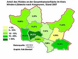 Die Wälder von Wiehengebirge (4290 ha) und Wesergebirge (980 ha) sind die größten geschlossenen Waldgebiete. Sie gehen auf die Aufforstung in Preußen Anfang des 19. Jahrhunderts zurück. Zuvor wurde das Wiehengebirge bis zum Gebirgskamm hin weidewirtschaftlich genutzt. Nennenswert sind außerdem das Gebiet der Stemmer Berge (750 ha), das Heisterholz (Staatsforst Minden, 850 ha), die Pohlsche Heide (690 ha) und der Lever Wald (610 ha). Aufgeschlüsselt nach Kommunen liegt der Waldanteil zwischen knapp 20 % in Lübbecke und kaum 3 % in Rahden.