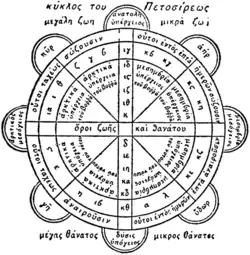Bei diesem Verfahren werden mittels Numerologie und eines Diagramms die Lebens- bzw. Todesaussichten eines Patienten oder einer anderen Person in einer kritischen Situation bestimmt, zum Beispiel die Siegesaussichten eines Gladiators. Dabei werden zunächst die Zahlenwerte der (griechischen) Buchstaben im Namen des Patienten addiert, dann eine dem Tag der Erkrankung im Mondmonat (also der Tag seit dem letzten Neumond) entsprechende Zahl dazugezählt, das Resultat wird durch die Zahl der Tage des jeweiligen Mondmonats (29 oder 30) dividiert. Der sich ergebende Divisionsrest ist die Zahl, die in dem Kreisdiagramm gesucht wird, das in mehrere Bereiche geteilt ist, beschriftet mit „großes Leben“, „mittleres Leben“, „kleines Leben“, „kleiner Tod“, „mittlerer Tod“ und „großer Tod“. Dementsprechend wird der Patient zum Beispiel schnell sterben (großer Tod) oder langsam gesunden (kleines Leben). Die Zahlen im Diagramm entsprechen dabei der griechischen Zahlschreibung, es werden also griechische Buchstaben mit α=1, β=2, γ=3 usw. verwendet. Daraus ergibt sich natürlich, dass laut dem Kreis des Petosiris die Chancen, an einer Erkrankung zu sterben, stets 1 zu 1 stehen.