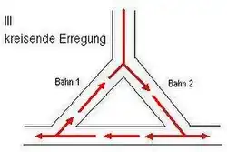 Das geschädigte Areal verlangsamt dabei den Durchtritt einer Erregung, bis es irgendwann gegenüber der folgenden refraktär, also schwer oder überhaupt nicht erregbar, ist. Diese Erregung kann das geschädigte Areal nun aber in der Gegenrichtung durchlaufen, da sie es zu einem Zeitpunkt erreicht, wo es möglicherweise nicht mehr refraktär ist. Ist nun die hinter dieser retrograden bzw. antidromen (in die entgegengesetzte Richtung verlaufende) Erregung zurückbleibende Refraktärstrecke kürzer als die Kreisbahn, wird die Erregung innerhalb des Kreises nicht mehr gelöscht und kann ihn permanent durchlaufen. Man spricht von einer kreisenden Erregung.