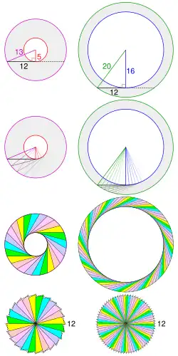- In Abbildung 1 ist die Strecke zwischen dem Berührungspunkt der Tangente des Innenkreises und dem Schnittpunkt mit dem Aussenkreis bei beiden Kreisringen gleich groß. Der Mathematiker Mamikon Mnatsakanian zeigte durch geometrische Transformation, dass in diesem Fall auch die Flächen der Kreisringe gleich groß sind. Die tangential am Innenkreis anliegende Strecke wird schrittweise um den Mittelpunkt des Kreises rotiert. Die dabei gebildeten Segmente können nach innen verschoben werden, bis sie sich im Mittelpunkt treffen. Je schmaler die Segmente gewählt werden, desto glatter wird der Rand der durch das Zusammenschieben gebildeten Kreisfläche.[1]