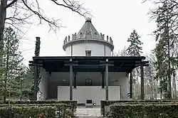 Das Grazer Krematorium mit Urnenfriedhof schließt nördlich an den Grazer Zentralfriedhof an und wurde zwischen 1931 und 1932 nach Plänen des Architekten Erich Boltenstern[12] im Auftrag des Feuerbestattungsvereines „Die Flamme“[13] errichtet. |
