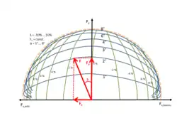Beispielhaft ist rot eingezeichnet ein Zustand im Bereich des Antriebsschlupfes. Bei etwa 1,7 % Schlupf (längs) und 2° Schräglaufwinkel (quer) lassen sich die mit Fy bezeichnete Kraft in Querrichtung und die mit Fx bezeichnete Kraft in Längsrichtung übertragen. F stellt dann die in der xy-Ebene vom Reifen auf die Fahrbahn übertragbare Gesamtkraft dar. Das Diagramm gilt für eine definierte Radlast Fz, d. h. für eine andere Radlast müsste ein eigenes Diagramm erstellt werden. Für eine reale Kurvenfahrt, die sicherlich Radlastschwankungen unterworfen ist, würde also eine krempelsche Reibungsellipse nicht ausreichen. Der Reifeninnendruck ist ebenso wie die Temperatur als konstant angenommen.