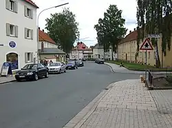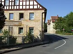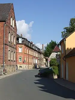 Abzweig der Straße Kreuz von der Kulmbacher Straße, im Hintergrund das frühere Sudhaus des Kreuz-Bräu