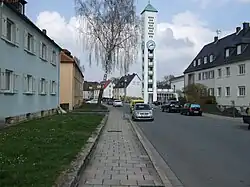Lippacherstraße mit der Kreuzkirche, links Genossenschaftshäuser aus den 1950er Jahren