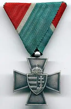 Getragen wird das Kreuz an einem 40 mm breiten Ordensband, welches die Nationalfarben Ungarns, rot, weiß und grün widerspiegelt. Das Ordensband selber ist dabei grün und rot gehalten und wird von einem 5 mm breiten weißen Streifen in der Mitte durchschnitten. Getragen wurde die Auszeichnung der ungarischen Tradition folgend an einem Dreiecksband über der linken Brusttasche.[3]