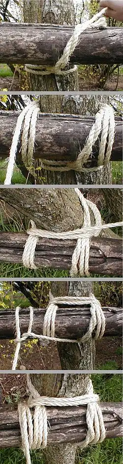Das Seil wird mittels Webeleinenstek oder Zimmermannsstek am senkrechten (tragenden) Balken angebunden. Das freie Ende des Seils liegt dabei direkt unter dem Querbalken. Dann wird das Seil hinter den Längsbalken und über den Querbalken geführt. Dies wird jeweils dreimal wiederholt. Anschließend wird der Bund noch durch Knebeln vor dem Verrutschen geschützt. Das lose Ende wird dann mit Webeleinenstek am Balken befestigt.