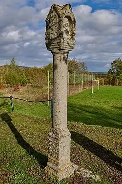 Der 240 cm hohe Kreuzdachbildstock besteht aus grauem Sandstein und entstand im Jahr 1629.