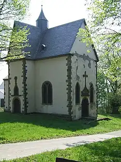 Die Kapelle aus verputzten Bruchsteinen mit Ecksteinen ließ laut einer Inschrift 1655 Freiherr Moritz von Büren erbauen, zunächst als Saalkirche mit einem eingezogenen, polygonal geschlossenen Chor im Osten. Bis 1671 wurde sie durch Einfügen eines kurzen Querschiffes zur Kreuzkirche erweitert, die in der Vierung mit einem achteckigen Dachreiter gekrönt wird. Der Innenraum des Langhauses ist mit einem Kreuzgratgewölbe überspannt, die der kurzen Querarme mit Tonnengewölben.