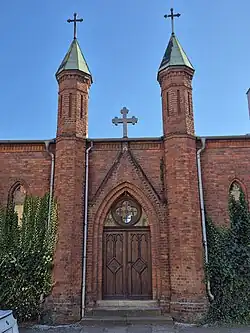 Es handelt sich um einen einschiffigen unverputzten Backsteinbau auf einem Feldsteinsockel, eine Saalkirche im neogotischen Stil. Mittig an der Straße befindet sich das Hauptportal, welches an den Flanken zwei schlanke polygonale Türmchen mit Spitzhelme zeigt. Über der zweiflügligen geschnitzten Tür befinden sich ein Wimperg sowie ein Kreuz als baulicher Schmuck. Fialenartig bekrönte Strebepfeiler und schmale, spitzbogige Fensterpaare gliedern die Fassade. Die gegenüberliegende Hoffassade besitzt dagegen nur eine einfache Lisenengliederung.[4]