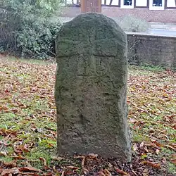 Der mittlere der fünf auf dem Kirchhof platzierten Kreuzsteine ist ein 90 cm hoher und 65 cm breiter Sandstein mit einer Dicke von 20 cm.[8]