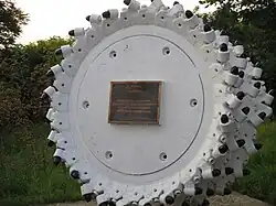 Die 11. Station wird durch eine Schrämmwalze dargestellt. Der mit Meißeln bestückte schneckenförmigen Aufsatz gehört zu einem Schrämmlader. Mit ihm wird die Kohle aus dem Flöz herausgeschnitten.