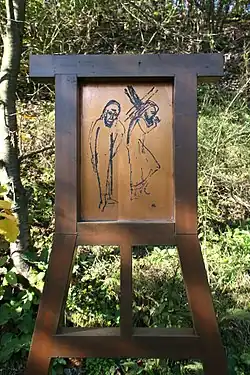 Ergänzend gibt es an jeder Station eine traditionelle Darstellung der Passion auf Kupfertafeln. Gestaltet wurden sie nach Rohrfederzeichnungen der Ordensschwester und Künstlerin Tisa von der Schulenburg.
