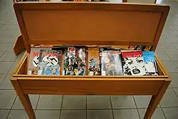 Ähnlich wie illustrierte Texte, Plakate und Fotoreportagen/Bildreportagen weisen Comics eine Kombinationen aus Bildern und Textelementen auf. Stephan Ditschke, Katherina Kroucheva und Daniel Stein nennen deshalb neben der sequenziellen Erzählweise "die Kombination von Text und Bild", "serielles Medium" und "kulturelle Artefakte" (= übliche Publikationsformate, wie comic book, comic strip, Magazine, Graphic Novel, Online-Plattform) als weitere Erkennungszeichen.[6] Das zweite Kriterium verweist auf den Umstand, dass viele Comics in regelmäßigen Zeitabständen als eigenständige Serie veröffentlicht werden, allerdings können Werke auch als in sich abgeschlossene Einzelstücke publiziert werden.