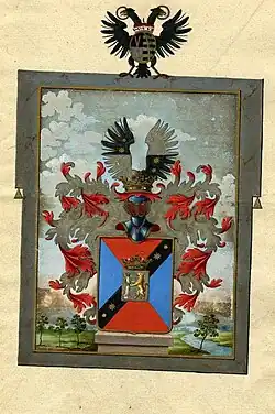 Blasonierung des Wappens von 1793: Schild schräg geviert an der schräglinken Trennungslinie mit einem schwarzen Balken und einem silbernen gekrönten Herzschild, darin ein goldener Löwe eine silberne gekrönte Säule, davor zwei gekreuzte Palmwedel, haltend, belegt, der Balken rechts und links vom Herzschild außen mit einer goldenen Kugel und innen mit einem goldenen Stern belegt. Felder rechts und links blau, oben und unten rot. Auf dem gekrönten Helm mit rot-silbernen Helmdecken ein offener von Schwarz und Silber übereck geteilten Flug, die schwarzen Felder mit je einer goldenen Kugel und zur Teilungslinie einem goldenen Stern, pfahlweise gestellt, belegt.