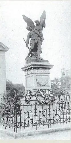 Es entstand ein hoher Sockel, auf dem eine Skulptur thronte. Sie stellte einen zusammenbrechenden, von einer Kugel getroffenen Soldaten dar, der an seiner linken Seite von einem Engel gestützt wurde. Der dem Soldaten zugewandte Engel wies mit seiner linken Hand zum Himmel.[1]