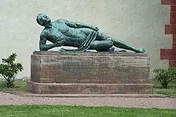 Den Entwurf für die große Bronzefigur lieferte der Bildhauer Richard Engelmann aus Weimar. Es ist ein Frühwerk seines Schaffens. Es stellt die Bronzefigur eines sterbenden Jünglings auf einem Steinsockel dar, ein für die damalige Zeit sehr seltenes Motiv.[1] Ein nicht ausgeführter Entwurf stammt von dem ebenfalls in Weimar tätigen Bildhauer Josef Heise.[2]