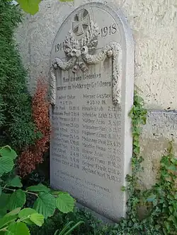 Neben der römisch-katholischen Kirche St. Johannes Evangelist (Dorfsulza) in Bad Sulza, besser Dorfsulza, befindet sich ein Kriegerdenkmal für die Gefallenen des Ersten Weltkrieges. Das Denkmal, eine halbrund nach oben abschließende Tafel aus Kunststein, steht an der Kirchenwand. Das Eiserne Kreuz bekrönt eine Inschrift mit den Namen der im Ersten Weltkrieg Gefallenen aus Bad Sulza. Zwischen den Jahreszahlen 1914–1918 ist Eichenlaub, das von einer Girlande getragen wird.[1] Laut Inschrift wurde das Denkmal 1926 gestiftet vom Kriegerverein, dem Gesangsverein und dem Burschenverein Dorfsulza. Das erhaltene Kriegerdenkmal steht nicht direkt auf der Liste der Kulturdenkmale in Bad Sulza, wohl aber die erwähnte Kirche.