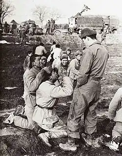 Mit der Kapitulation der deutschen 6. Armee nach der Schlacht von Stalingrad im Februar 1943 sowie von rund 130.000 Angehörigen des Deutschen Afrikakorps im Tunesienfeldzug drei Monate später gerieten zum ersten Mal im Zweiten Weltkrieg große Wehrmachtsverbände in alliierte Kriegsgefangenschaft. Mit der Befreiung Frankreichs durch die Westmächte nach der Invasion in der Normandie stieg die Zahl der in anglo-amerikanische Kriegsgefangenschaft geratenen Deutschen von Sommer 1944 bis Frühjahr 1945 von 200.000 auf über eine Million Mann an. Mit der bedingungslosen Kapitulation der Wehrmacht gerieten bei Kriegsende rund 7,5 Millionen deutsche Kapitulationsgefangene in alliierte Gefangenschaft. Vor allem in den „Rheinwiesenlagern“ wie Remagen starben tausende deutsche Kriegsgefangene an Hunger und Erschöpfung in notdürftigen Erdlöchern oder auf freiem Feld.[41]