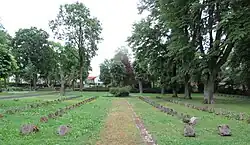 Hoher Obelisk von 1946 zu Ehren der hier bestatteten 23 Kriegsgefangenen aus der Sowjetunion und von 65 ausländischen Zwangsarbeitern. 2012 wurde die Anlage erneuert, einschließlich der Einfriedung.
