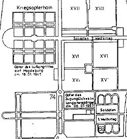 Am 16. Januar 1945 erfolgte der schwerste von insgesamt 38 alliierten Luftangriffen auf Magdeburg in den Jahren 1940 bis 1945. Am 16. Januar 1945 starben dabei 2.000 bis 2.500[5], oder 4.000 Menschen[6], bei den anderen Angriffen zusammen 2.500[7] Insgesamt hat es also bis 6.500 Opfer gegeben. Zwar wurden Bombentote auch auf anderen Friedhöfen beerdigt, doch die allermeisten in Gräberfeldern auf dem Westfriedhof. 2.680 hier bestattete Bombenopfer wurden registriert, davon waren 600 unbekannte oder nicht identifizierbare, meist verkohlte Leichen in einem gesonderten Massengrab (16. Januar 1945). Bei sieben der Angriffe fielen jeweils Hunderte von Toten an. Trotz der großen Zahl wurden sie in Särgen beigesetzt, wenn auch nach dem 16. Januar in teilweise sehr einfachen. Die ursprünglichen Reihengräber mit Grabkreuzen sind nicht erhalten.