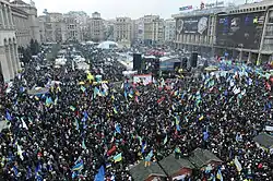 Am 21. Februar 2014, nach der Eskalation der Euromaidan-Proteste, unterzeichnete der ukrainische Präsident Wiktor Janukowytsch eine Vereinbarung zur Beilegung der Krise mit den Oppositionsführern Vitali Klitschko, Oleh Tjahnybok und Arsenij Jazenjuk. Die von den Außenministern Deutschlands, Polens und Frankreichs, Frank-Walter Steinmeier, Radosław Sikorski und Laurent Fabius vermittelte Vereinbarung sah neben der Entwaffnung rechtsextremer Milizen[33] auch eine Rückkehr zur Verfassung von 2004, die Bildung einer Regierung der nationalen Einheit und eine vorgezogene Präsidentschaftswahl vor.[34] Obwohl Putin den Westen später scharf dafür kritisierte, das Abkommen ausgesetzt zu haben, wurde es vom russischen Vermittler Wladimir Lukin nicht unterzeichnet. Lukin deutete an, Putin habe die Vereinbarung nicht gebilligt. Der „Maidan-Rat“ stimmte dem Abkommen mit 34:2 Stimmen zu, dieses wurde am nächsten Tag von der auf dem Maidan versammelten Menge jedoch abgelehnt und Janukowytsch wurde von einem Redner ein Ultimatum gestellt, bis spätestens am nächsten Tag zurückzutreten. In der Folge verließ ein großer Teil der Polizei und der Sicherheitskräfte ihren Posten.[35][36]