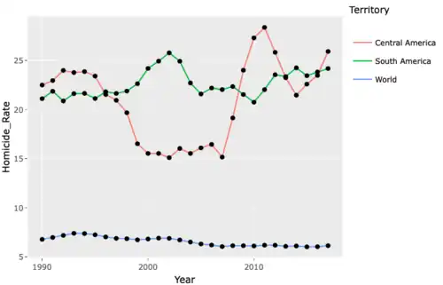 Auf der Erde insgesamt gab es nur einen kleinen Rückgang von 7,4 (1993) auf 6 (2007). Seither stagnieren diese Werte. Das liegt daran, dass es auch Regionen mit einer Zunahme gab, die die Erfolge in den rückläufigen Regionen fast ausglichen. Zunahmen zumindest von Mordraten gab es in Mittel- und Südamerika, besonders in bestimmten Karibikstaaten. Spitzenreiter sind hier El Salvador mit 61,8 und Jamaika mit 57 Fällen pro 100.000 Einwohnern (2017).[23]