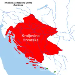 Krešimir IV. (1058–1074/1075), einer der bedeutendsten kroatischen Herrscher, vergrößerte sein Reich erheblich. Er war der Sohn einer venezianischen Mutter und hatte seine Bildung in Venedig erfahren.[18] Er nannte sich auch „König von Dalmatien“, was auch sein Nachfolger Demetrius oder Dmitar Zvonimir (1075–1089) tat, meist Zvonimir genannt. Er war der „last strong ruler of the early Croation kingdom“.[19]
