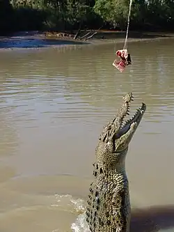 Um Fleischstücke abzureißen, packen sie das Opfer mit den Zähnen und drehen sich selbst mehrfach um die eigene Achse. Dabei zerreißen sie ihre Beute an den Stellen, an denen sie mit ihren Zähnen eine Perforation hinterlassen haben. Um das Zerstückeln der Beute zu erleichtern, verstecken sie den Kadaver oft ein paar Tage, damit er weicher wird. Krokodile sind nicht in der Lage, Nahrung zu kauen, deshalb verschlucken sie abgerissene Fleischstücke vollständig. Sie besitzen häufig Gastrolithen, deren Funktion allerdings noch nicht restlos geklärt ist. Nach den beiden bekanntesten Hypothesen dienen diese Steine im Magen entweder zur Zerkleinerung der Nahrung oder als Ballast zur Verringerung des Auftriebes im Wasser.