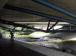 Nachdem die neuen Widerlager errichtet wurden, kamen ab März 2017 acht Schwerlasttransporter aus Steinach am Brenner mit jeweils einem Stahldreieck mit den Maßen 16 Meter Länge, 5,5 Meter Breite, fast 4 Meter Höhe und etwa 25 Tonnen schwer, die mit einem Autokran passgenau eingesetzt wurden. Mit Verbindungsrohren quer über die Dreisam wurden sie an den Knoten angeschweißt.[10] Im April begannen die Schalungsarbeiten für die Betonierung. In der Nacht vom 27. auf den 28. Juni 2017 wurde während 13 Stunden mit 70 Arbeitern die Kronenbrücke betoniert. 150 Ladungen Transportbeton à 20 Tonnen, das entspricht 1.200 Kubikmeter, wurden verarbeitet. Ursprünglich sollte in der Nacht vom 21. auf den 22. Juni betoniert werden, aber da war es zu heiß. Vier Wochen dauerte anschließend die Trocknung und Aushärtung des Betons.[12][13][14] Nach Abdichtung, Geländermontage und Freigabe für Fußgänger und Radfahrer wurde Anfang Dezember die Behelfsbrücke abgebaut.[15][16] Anschließend wurde die Radwegrampe an der Südostecke gebaut.