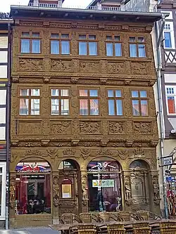 Im Jahr 1875 wurden die ursprünglich im zweiten Obergeschoss befindlichen Speicherfenster und eine Tür entfernt und durch Fenster ersetzt. Im Erdgeschoss wurde ein Ladengeschäft im Stil des Neobarock eingefügt, dessen Fassade sich an der Gestaltung der übrigen Fassade orientiert. Die Schnitzarbeiten wurden von Gustav Kuntzsch ausgeführt. Das Auslagenfenster wurde dabei entfernt. Die Veränderung der Fassade wurde in der damaligen Zeit in der Öffentlichkeit kritisiert.[3] Mehrfach versuchten spätere Besitzer des Hauses zwischen 1906 und 1952 die bemerkenswerte Fassade des Hauses zu verkaufen, was jedoch verhindert wurde. Aufgrund der starken Verzierung der Fassade, die die Fachwerkkonstruktion verdeckt, ging man in der Vergangenheit unrichtiger Weise davon aus, dass es sich bei dem Bau nicht um ein Fachwerkhaus handelt.
